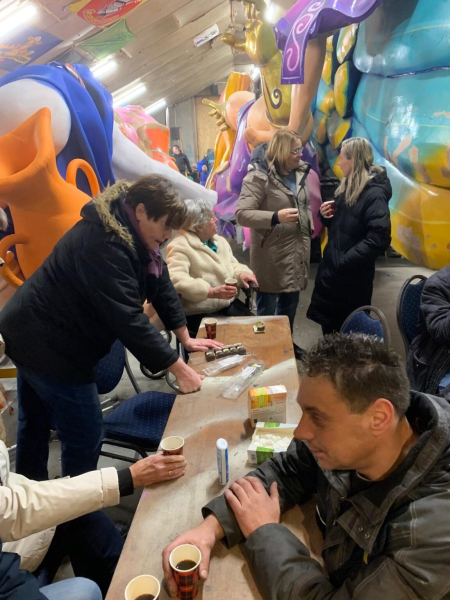 • In een andere loods werkten jongeren en ouderen zij aan zij aan de carnavalswagen: plakken, knippen, schilderen – met zichtbaar plezier en toewijding.